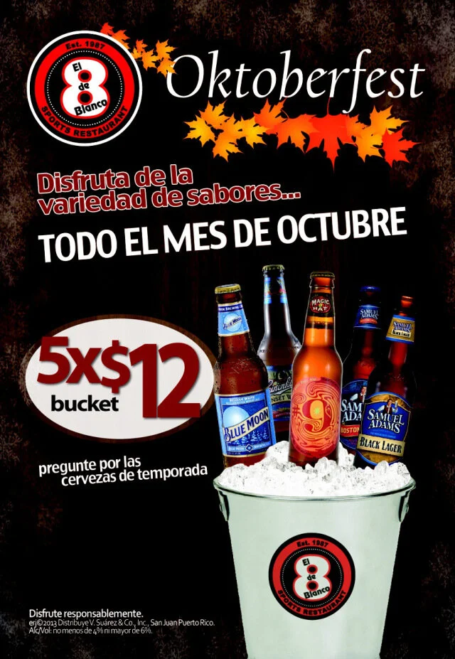 Se sigue celebrando el Oktoberfest en cada rincón en Puerto Rico y llegamos hasta El 8 de Blanco en Río Piedras donde tienen una oferta tentadora. Durante el mes de octubre El 8 de Blanco tendrá el Bucket de Oktoberfest; 5 cervezas por $12.