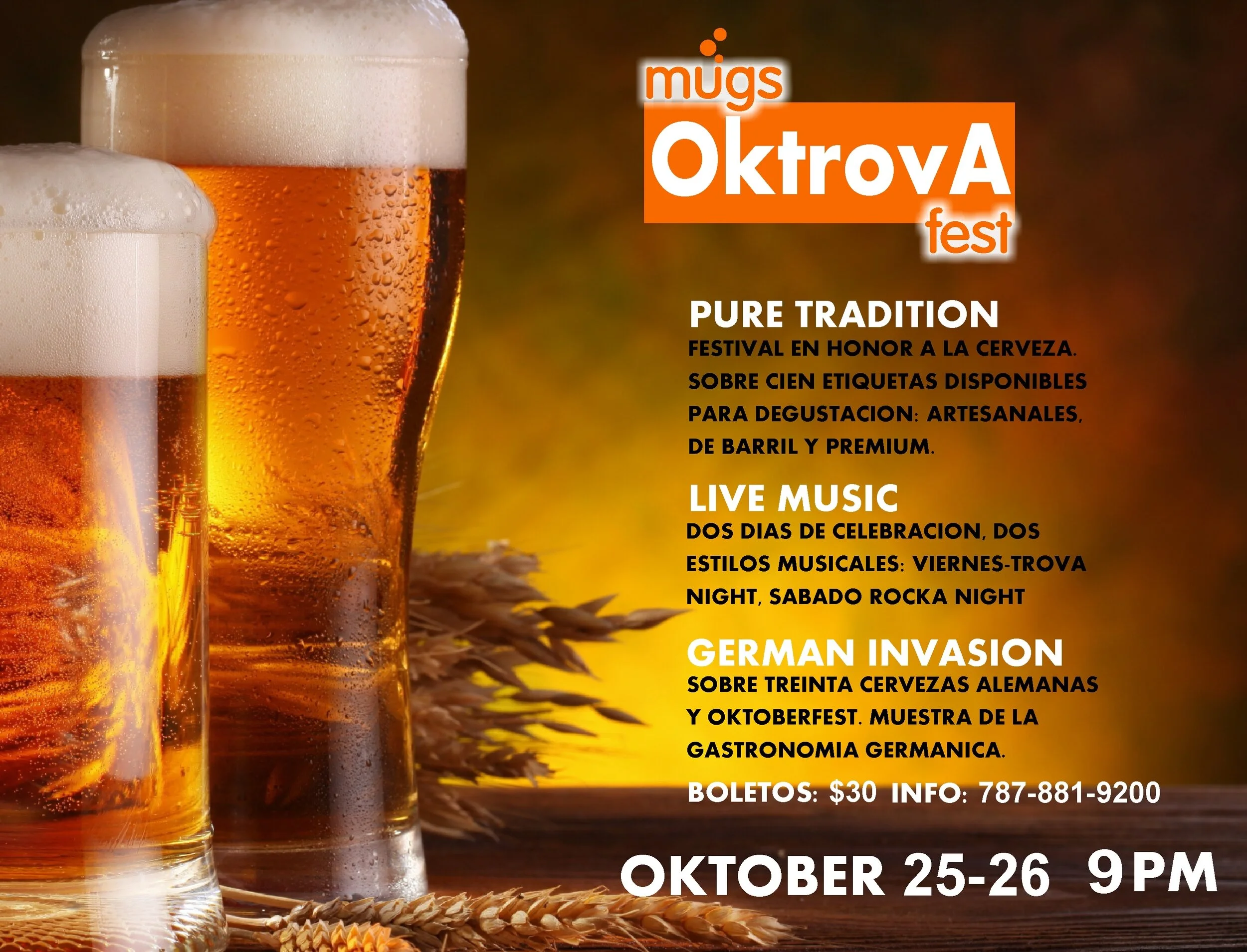 Siguiendo con las celebraciones del Oktoberfest esta una muy particular, el Oktrova Fest de Mugs en Plaza del Norte, Hatillo. Este evento de dos días ofrecerá a los asistentes sobre 30 cervezas alemanas, música en vivo (trova y rock) y muestra gastronómica de comida alemana.