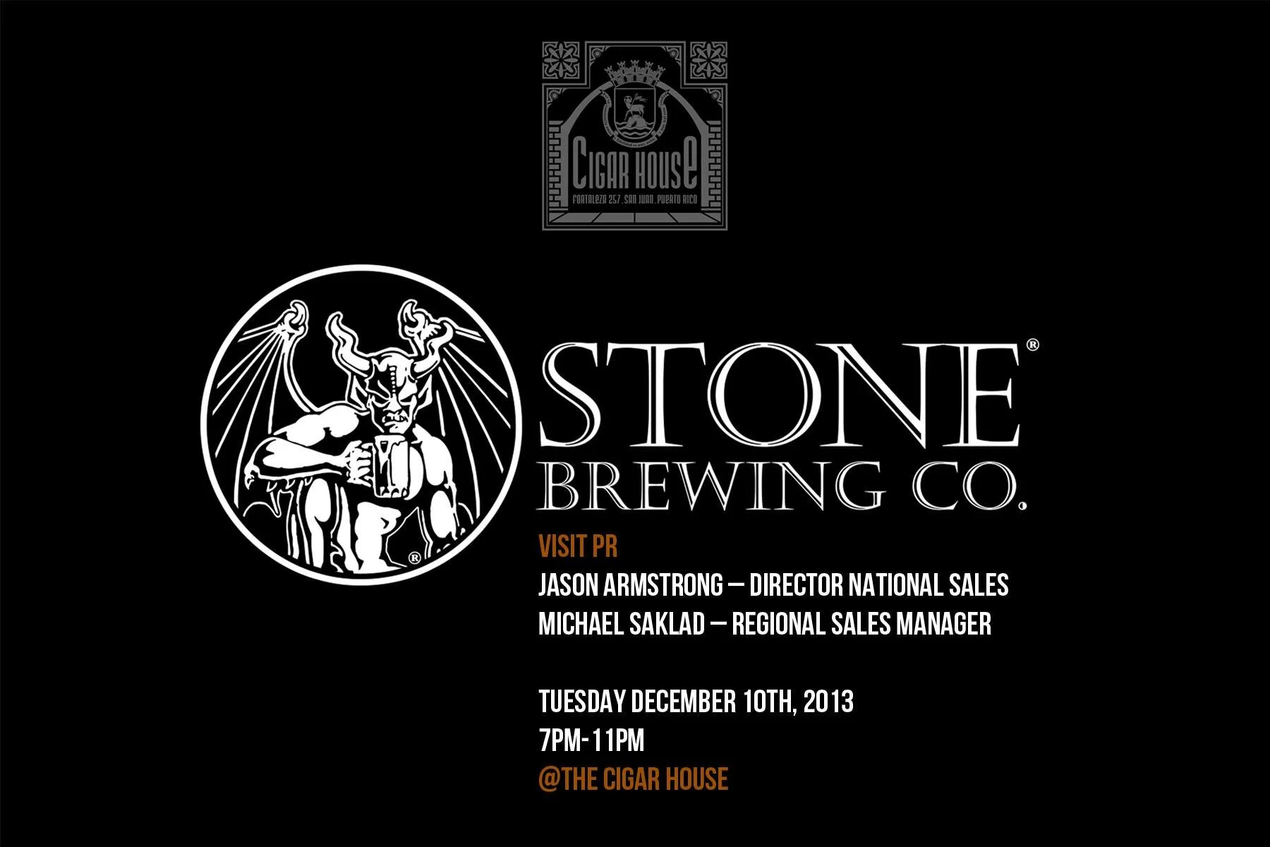 Stone Brewing continúa su estancia en la isla con la visita a The Cigar House mañana martes 10 de diciembre a partir de las 7pm. Allí los asistentes podrán parear un buen cigarro con buenas cervezas de Stone Brewing.