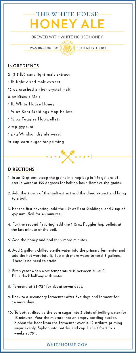 ¿Sabías que en la cocina de la Casa Blanca se elabora una cerveza? Pues la realidad es que si, en la cocina del Pesidente de los Estados Unidos se elabora una cerveza tipo "Ale" con una combinación con varios tipos de maltas, miel de la propia Casa Blanca, etc.