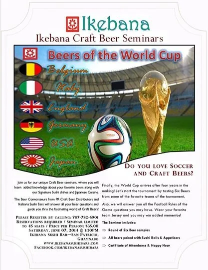 Ikebana Sushi Bar and Japanese Restaurant anunció que el 7 de junio estará llevando a cabo en su local en San Patricio un seminario de cervezas artesanales titulado Beers of the World Cup, el cual tendrá como tema la Copa Mundial de fútbol. El seminario consiste de seis rondas de cervezas, las cuales son pareadas con “sushi rolls” y aperitivos.
