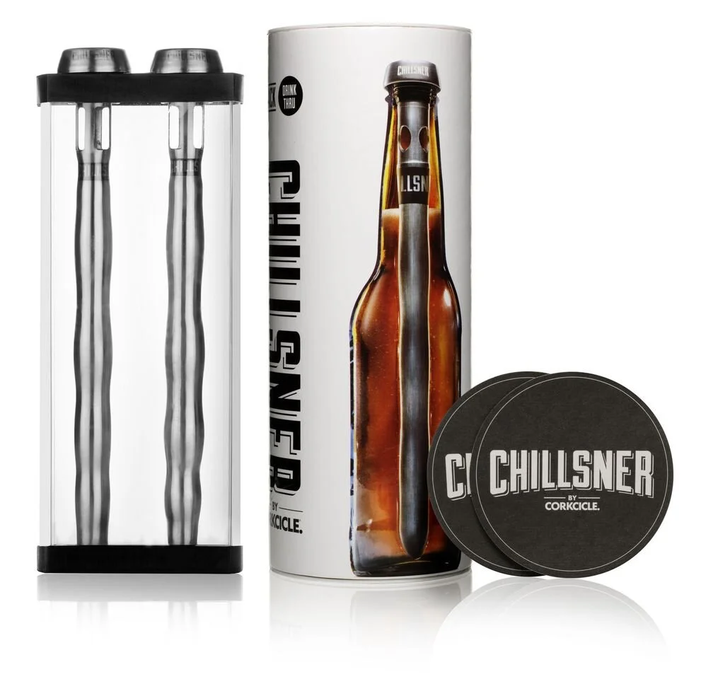 Otra sistema similar es el Chillsner de Corkcicle, pero el mismo está diseñado para botellas, en vez de latas. Al colocar la botella por 45 minutos dejará lista la cerveza para tu disfrute. El sistema provee espacio para dos botellas.