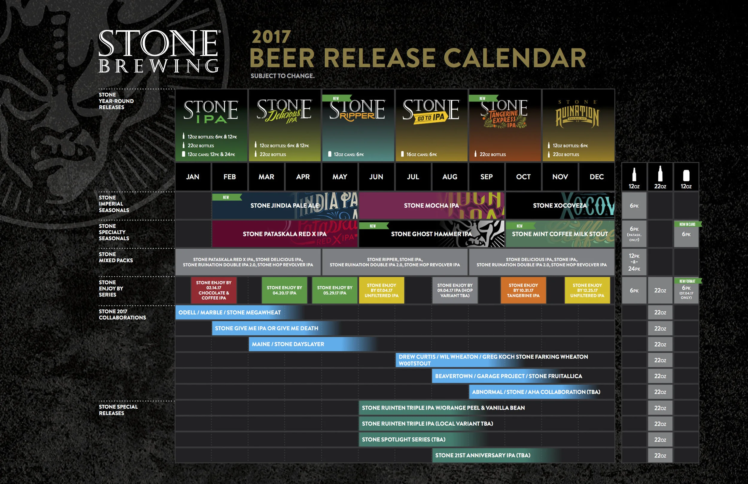 Stone publicó en el día de hoy el calendario de lanzamientos de sus cervezas, el cual incluye cervezas que ya conocemos que están todo el año o en temporada, hasta nuevas cervezas.